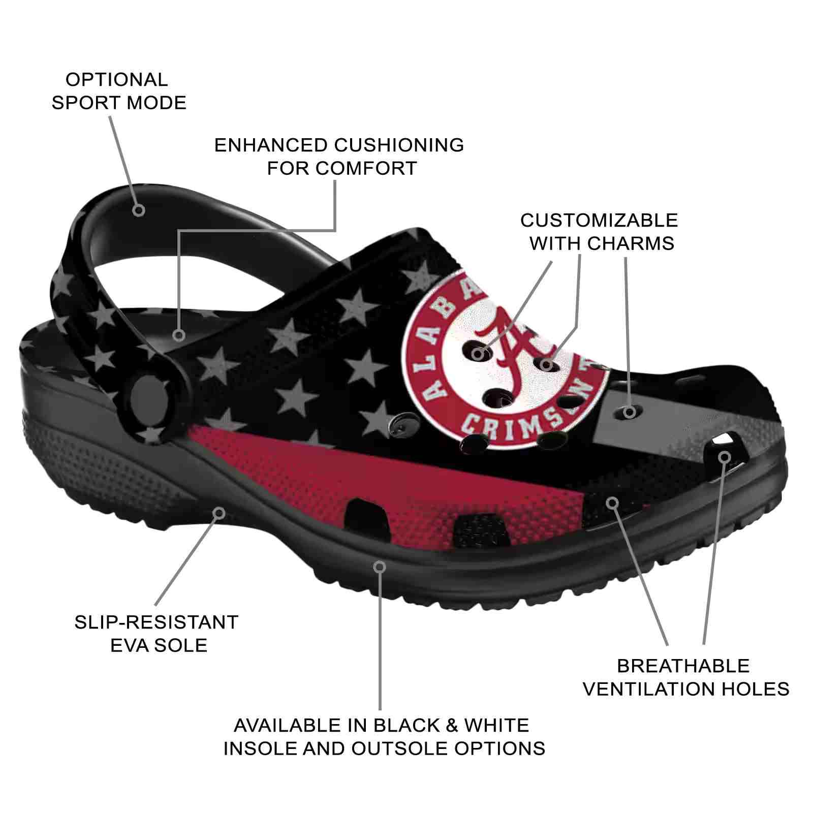 As part of our Alabama Crimson Tide Crocs and NCAA Crocs collections, these unique Clog are designed to let your love for your favorite shine bright.