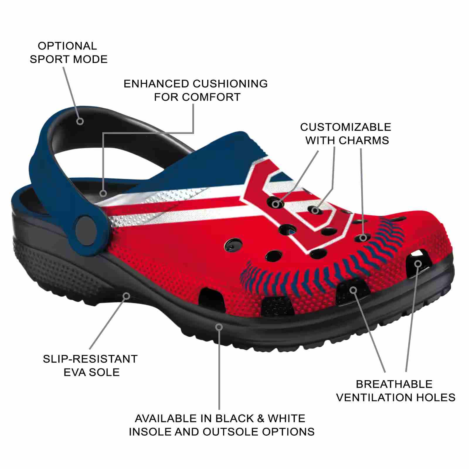 As part of our Cleveland Guardians Crocs and MLB Crocs collections, these unique Clog are designed to let your love for your favorite shine bright.