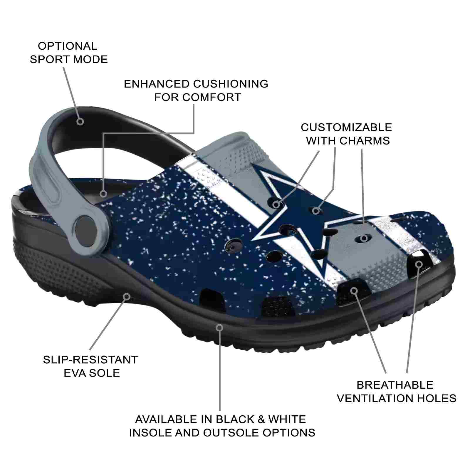 As part of our Dallas Cowboys Crocs and NFL Crocs collections, these unique Clog are designed to let your love for your favorite shine bright.