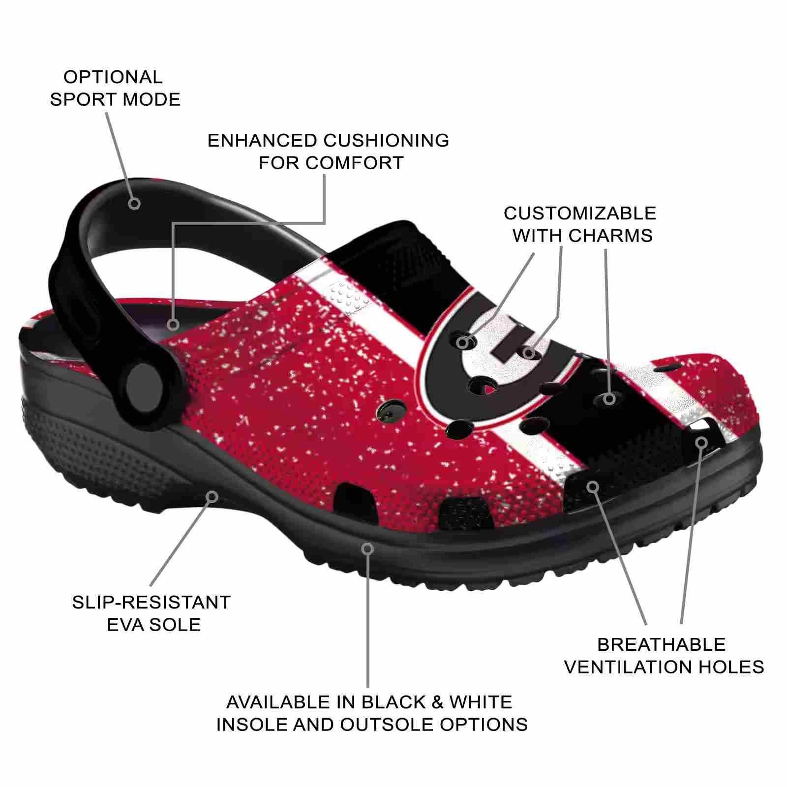 As part of our Georgia Bulldogs Crocs and NCAA Crocs collections, these unique Clog are designed to let your love for your favorite shine bright.