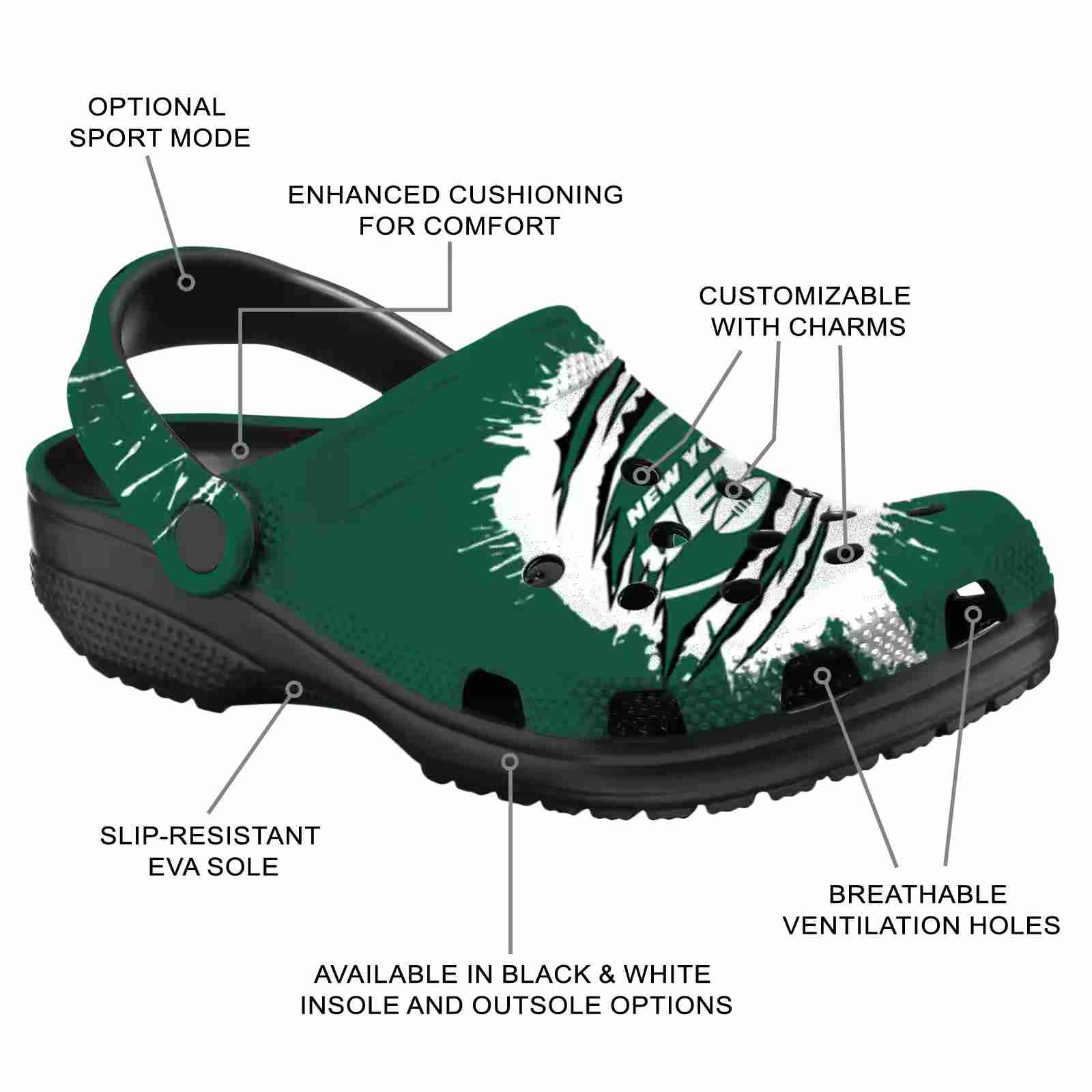 As part of our New York Jets Crocs and NFL Crocs collections, these unique Clog are designed to let your love for your favorite shine bright.