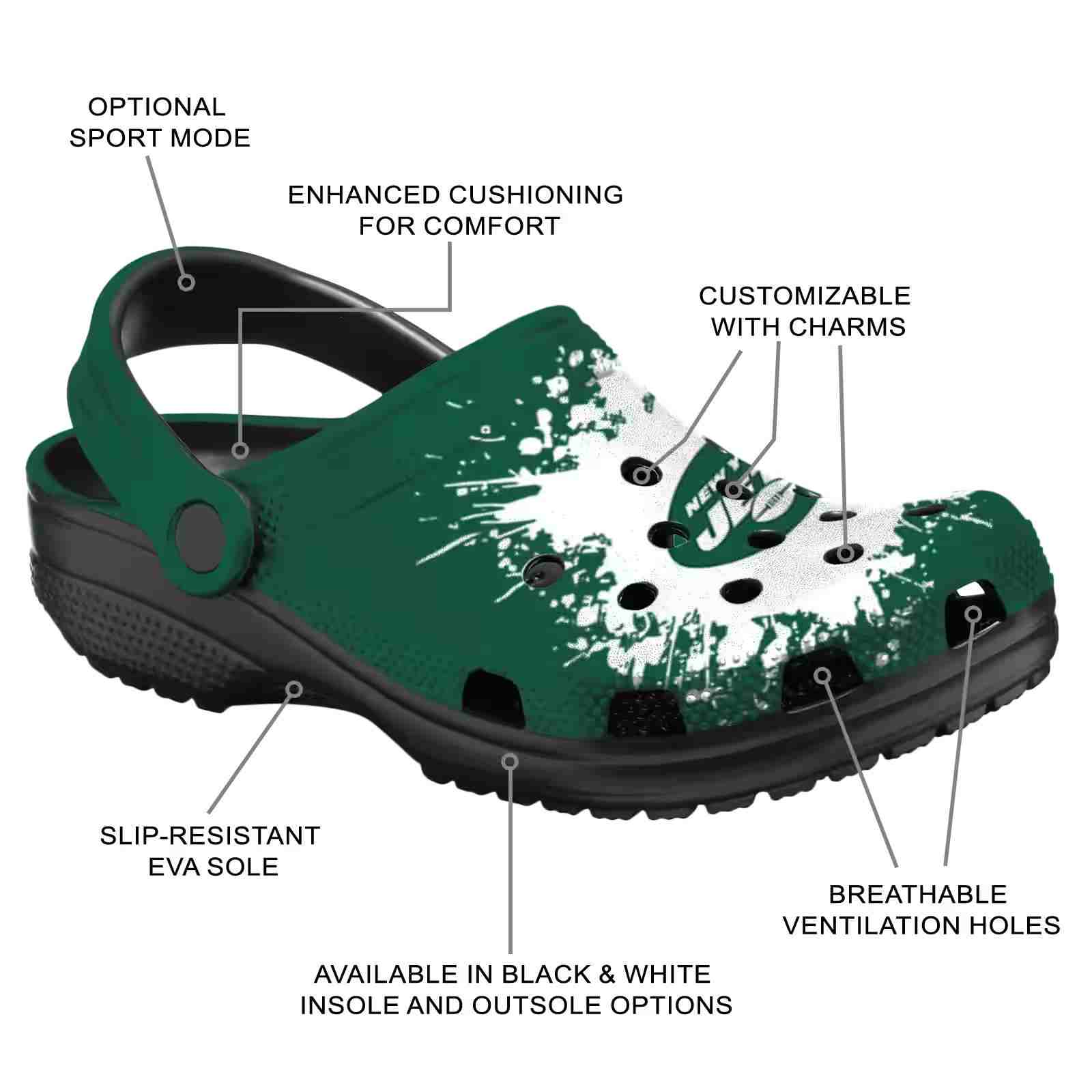 As part of our New York Jets Crocs and NFL Crocs collections, these unique Clog are designed to let your love for your favorite shine bright.