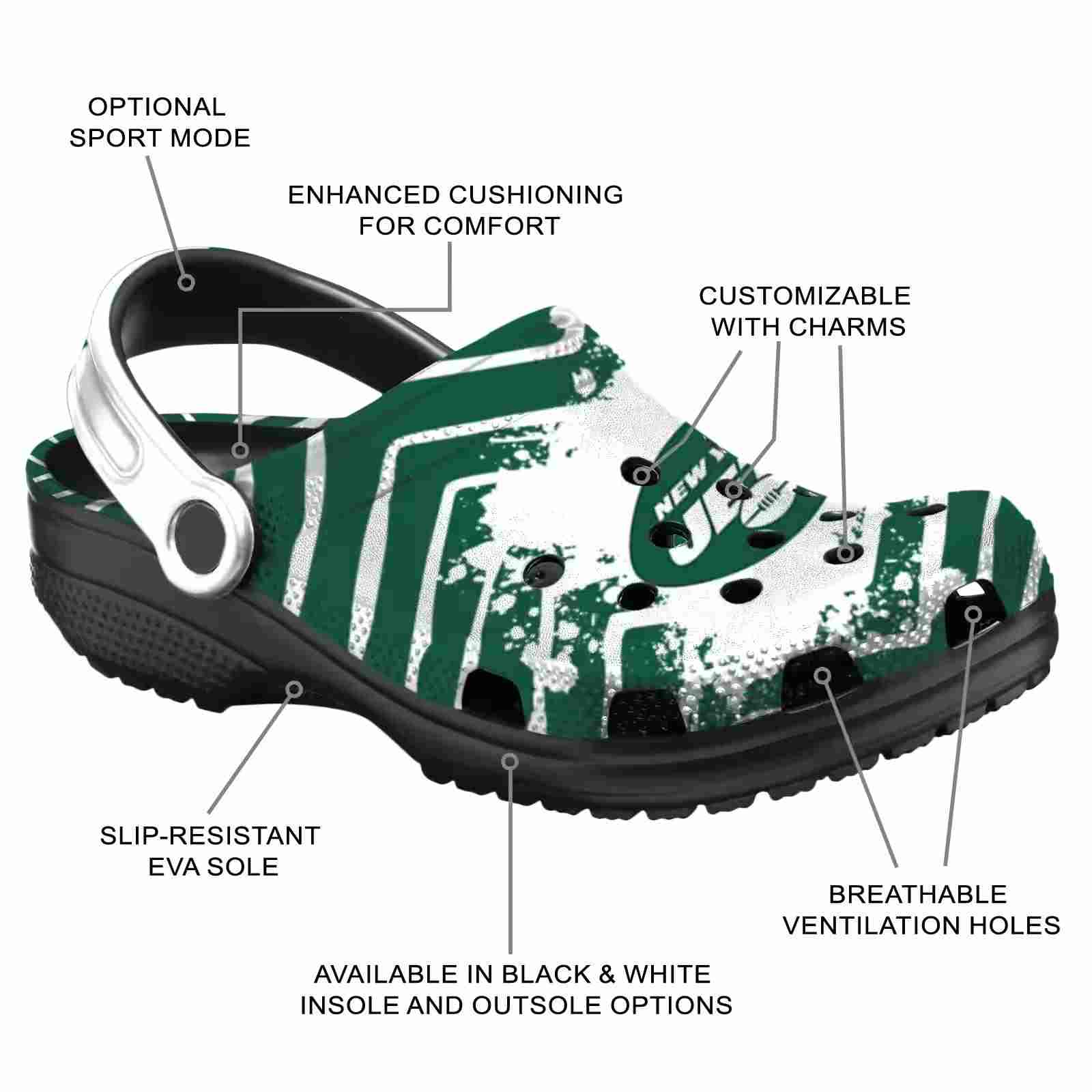 As part of our New York Jets Crocs and NFL Crocs collections, these unique Clog are designed to let your love for your favorite shine bright.