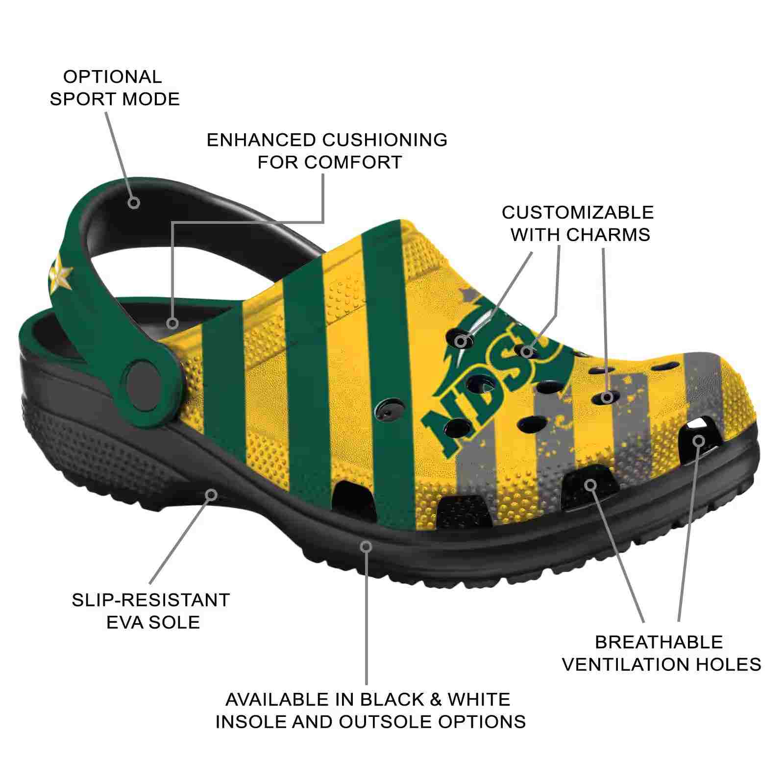 As part of our North Dakota State Bison Crocs and NCAA Crocs collections, these unique Clog are designed to let your love for your favorite shine bright.