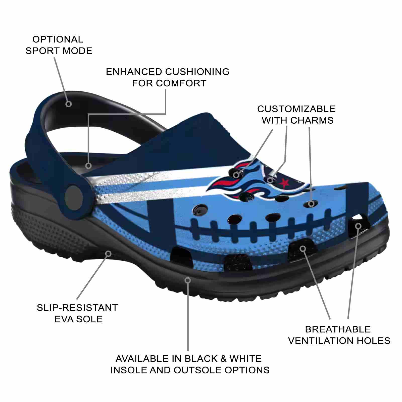 As part of our Tennessee Titans Crocs and NFL Crocs collections, these unique Clog are designed to let your love for your favorite shine bright.