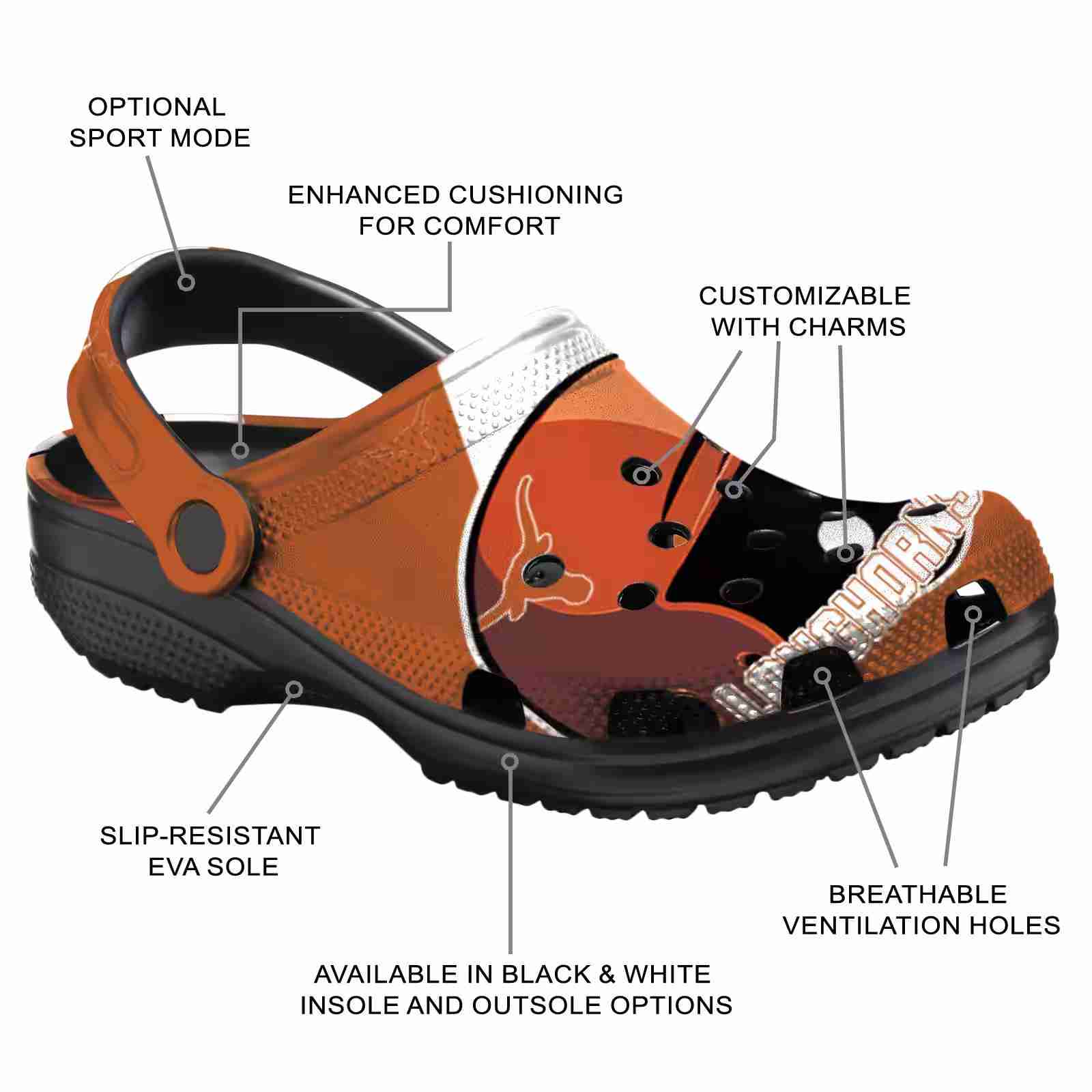 As part of our Texas Longhorns Crocs and NCAA Crocs collections, these unique Clog are designed to let your love for your favorite shine bright.