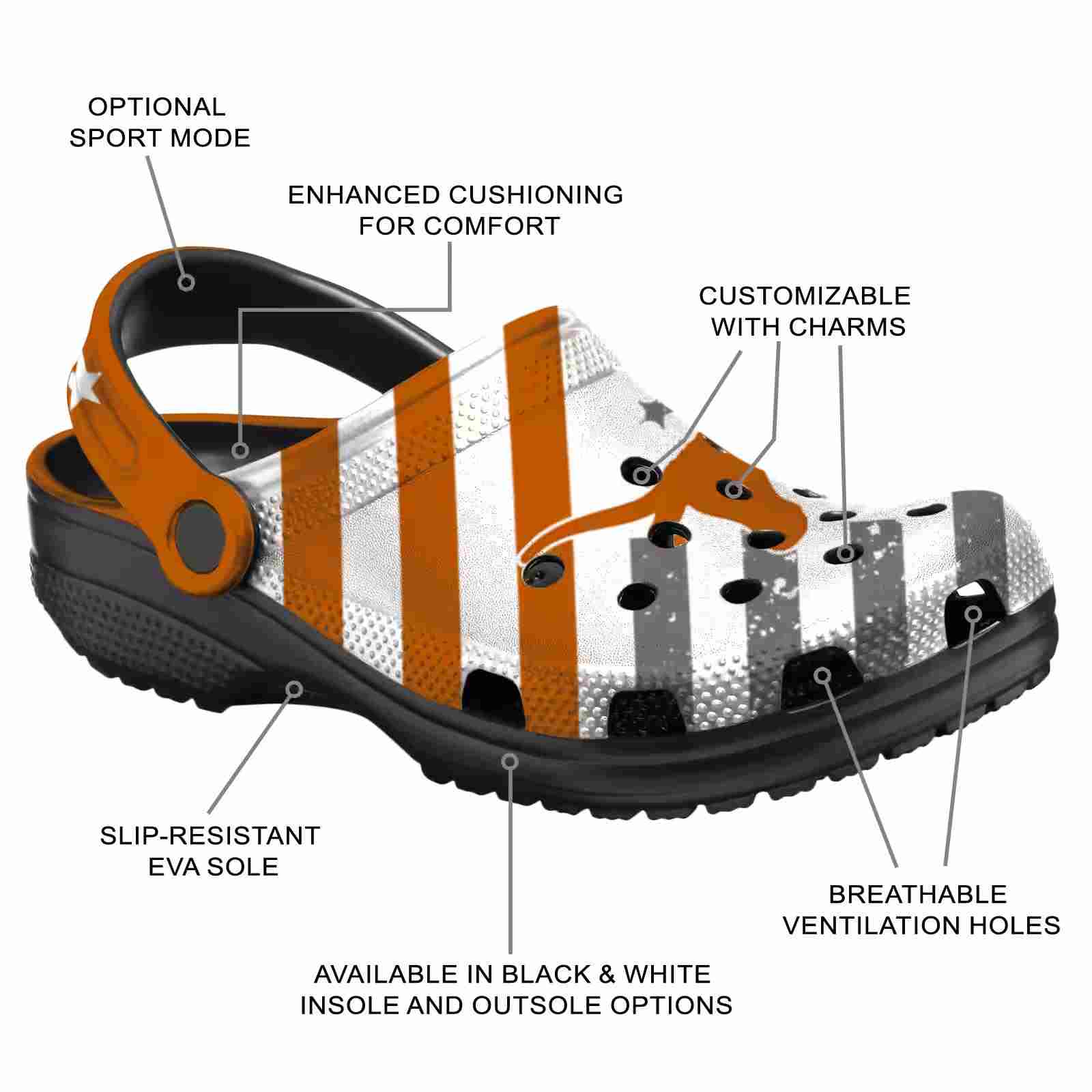 As part of our Texas Longhorns Crocs and NCAA Crocs collections, these unique Clog are designed to let your love for your favorite shine bright.