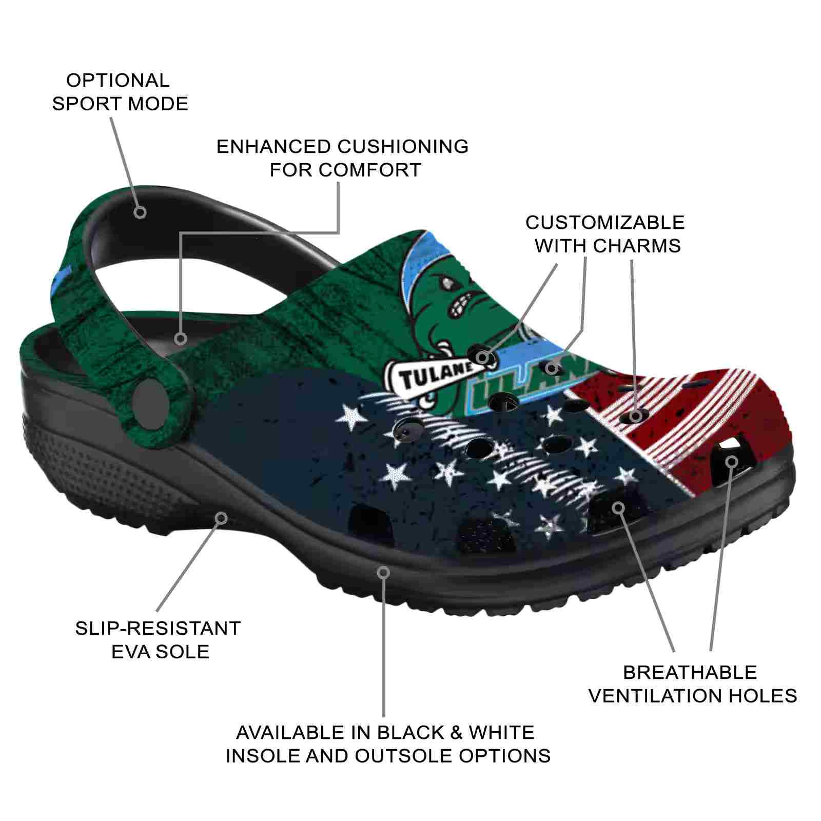 Custom Tulane Green Wave Star-Spangled Side Pattern ClogTVC1801747