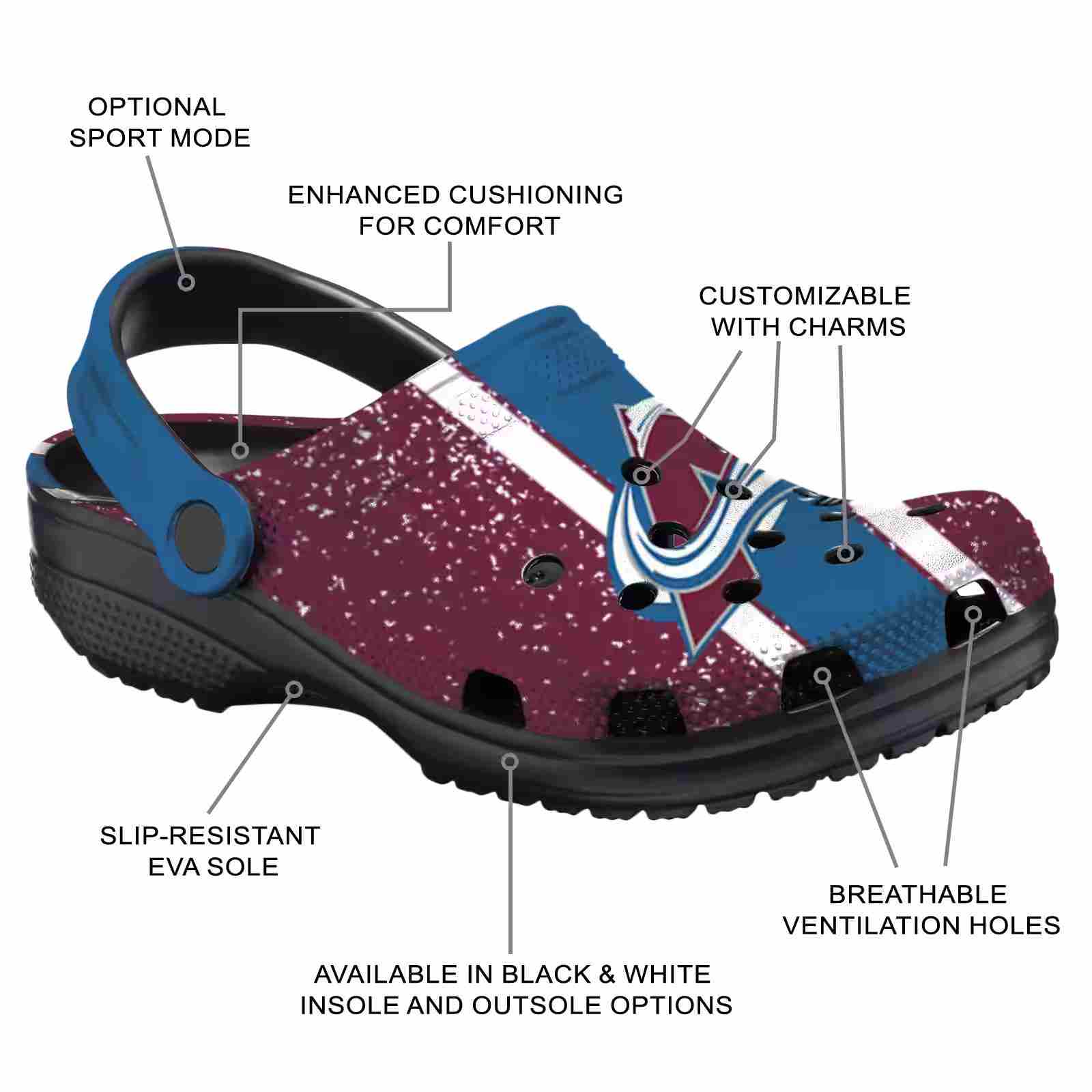 As part of our Colorado Avalanche Crocs and NHL Crocs collections, these unique Clog are designed to let your love for your favorite shine bright.