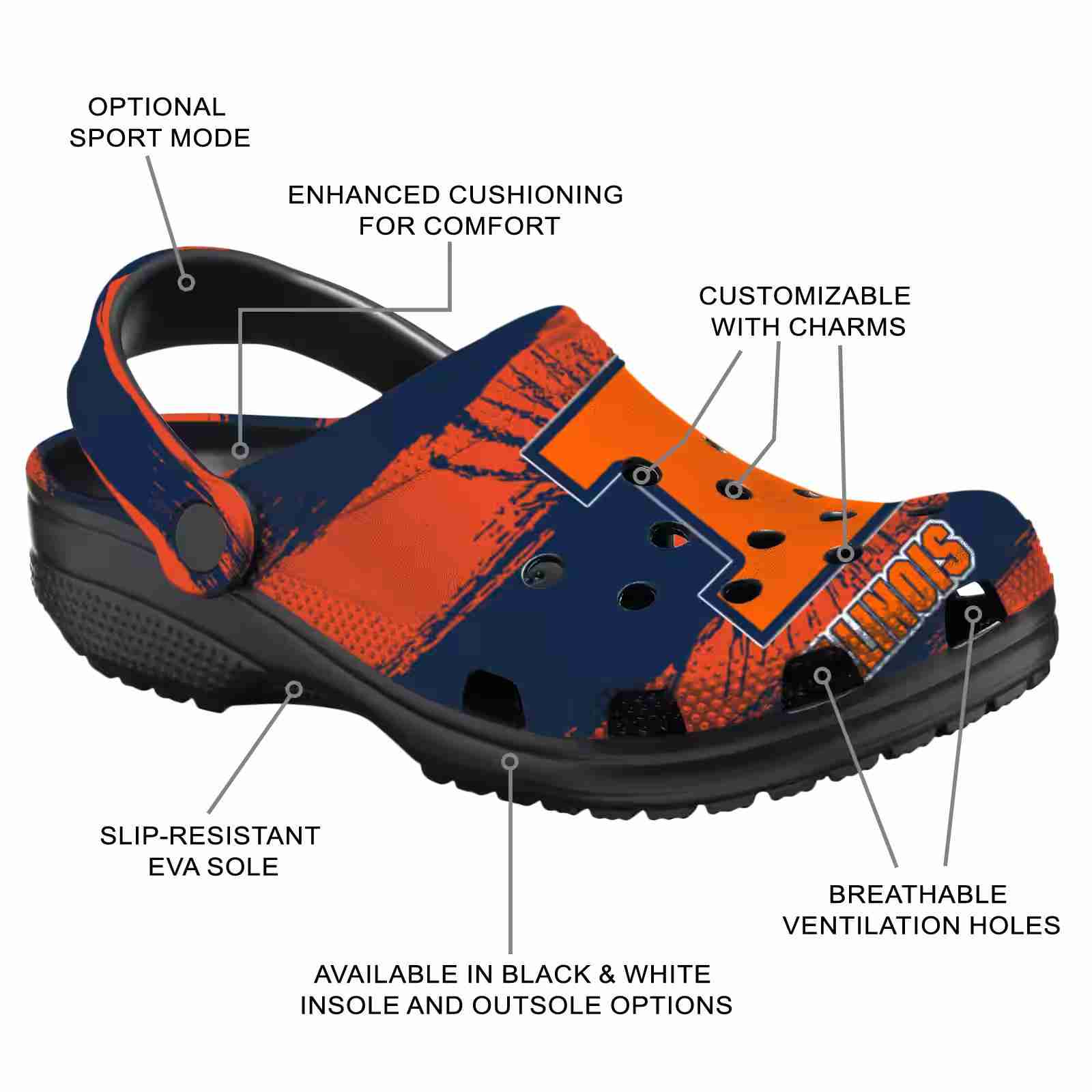 As part of our Illinois Fighting Illini Crocs and NCAA Crocs collections, these unique Clog are designed to let your love for your favorite shine bright.