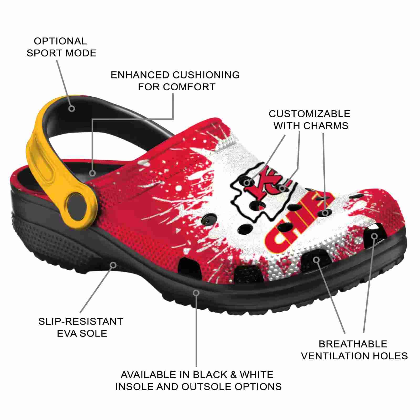 As part of our Kansas City Chiefs Crocs and NFL Crocs collections, these unique Clog are designed to let your love for your favorite shine bright.
