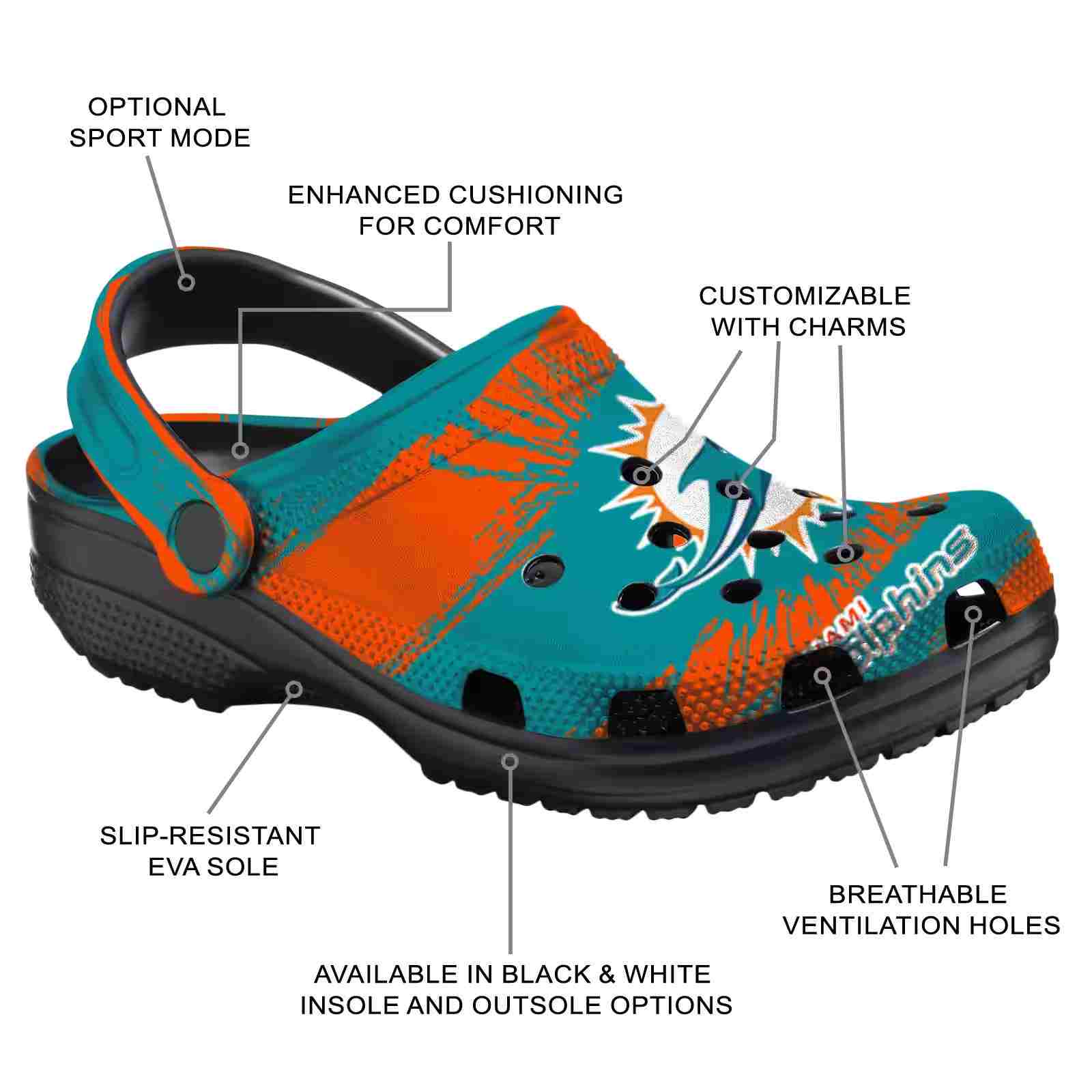 As part of our Miami Dolphins Crocs and NFL Crocs collections, these unique Clog are designed to let your love for your favorite shine bright.