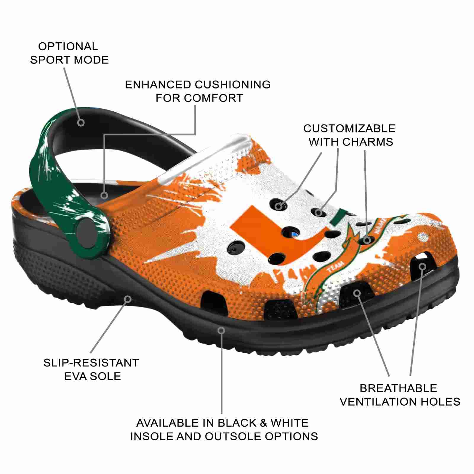 As part of our Miami Hurricanes Crocs and NCAA Crocs collections, these unique Clog are designed to let your love for your favorite shine bright.