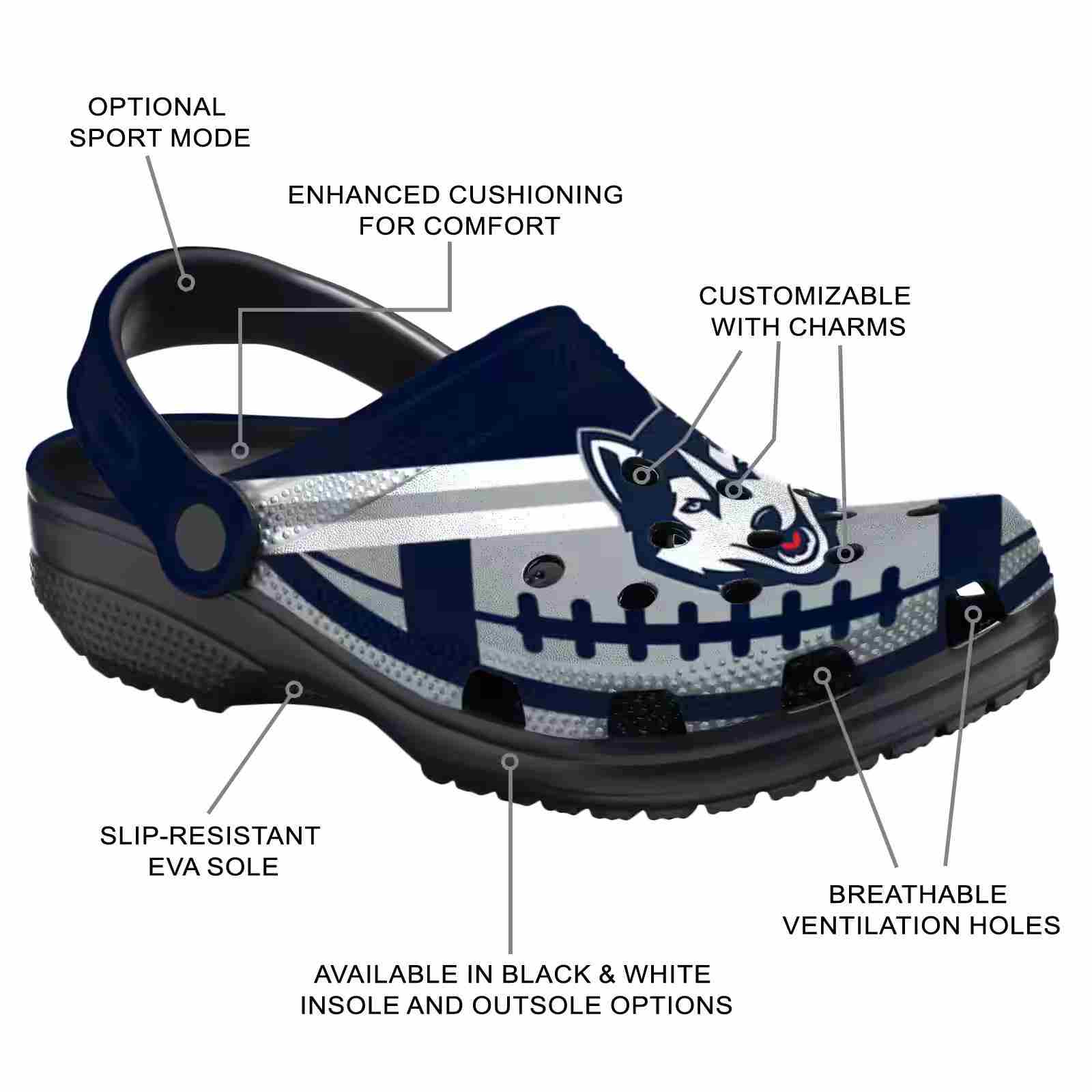 As part of our UConn Huskies Crocs and NCAA Crocs collections, these unique Clog are designed to let your love for your favorite shine bright.