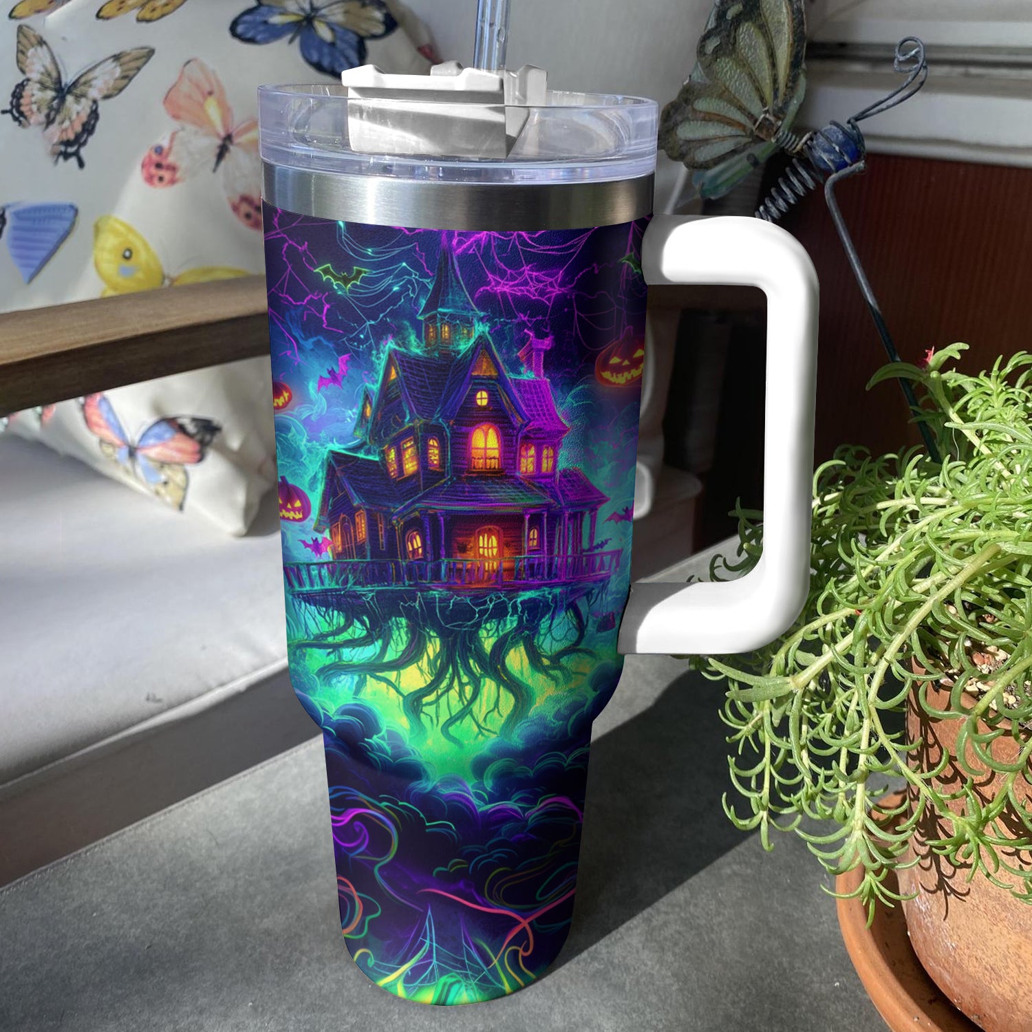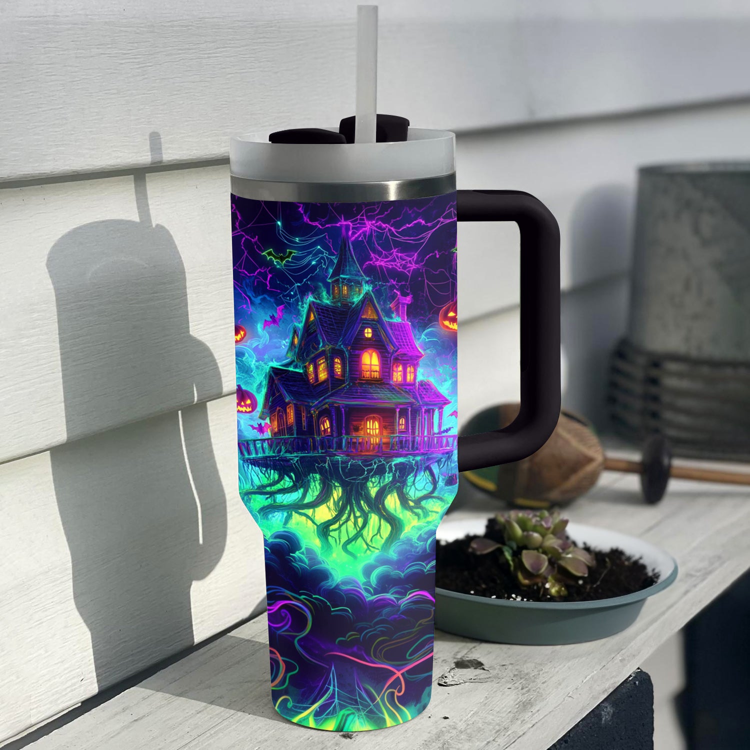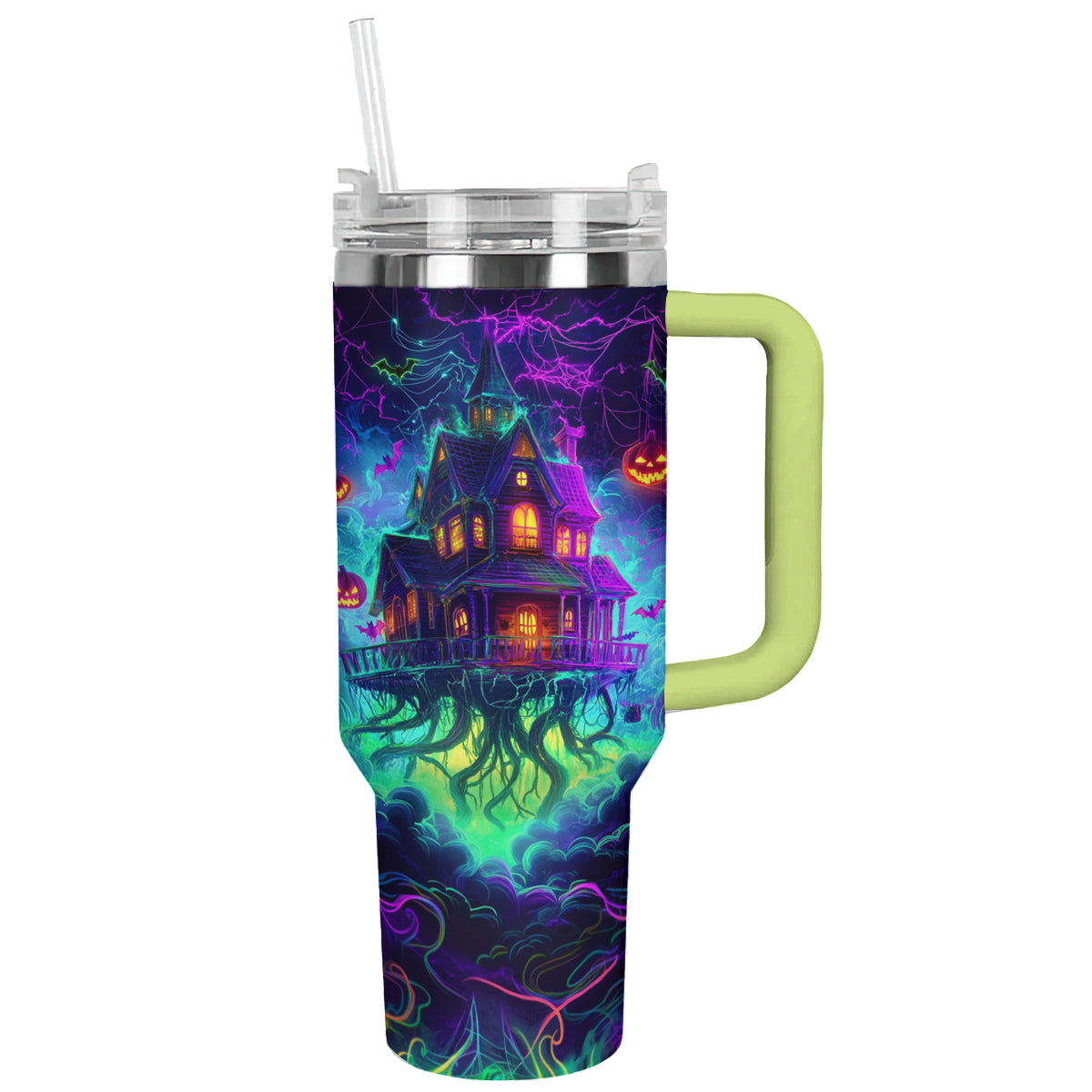 Halloween Neon Haunted House Custom Stanley Cup 40 oz 30 oz Tumbler With HandleTVC2301680