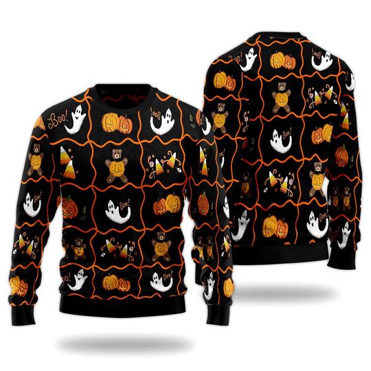 Halloween Pattern Ugly Sweater, Boo Ghost Pumpkin Shirt, Cute Holiday Sweatshirt