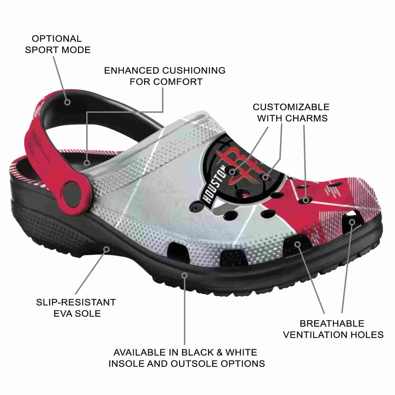 As part of our Houston Rockets Crocs and NBA Crocs collections, these unique Clog are designed to let your love for your favorite shine bright.