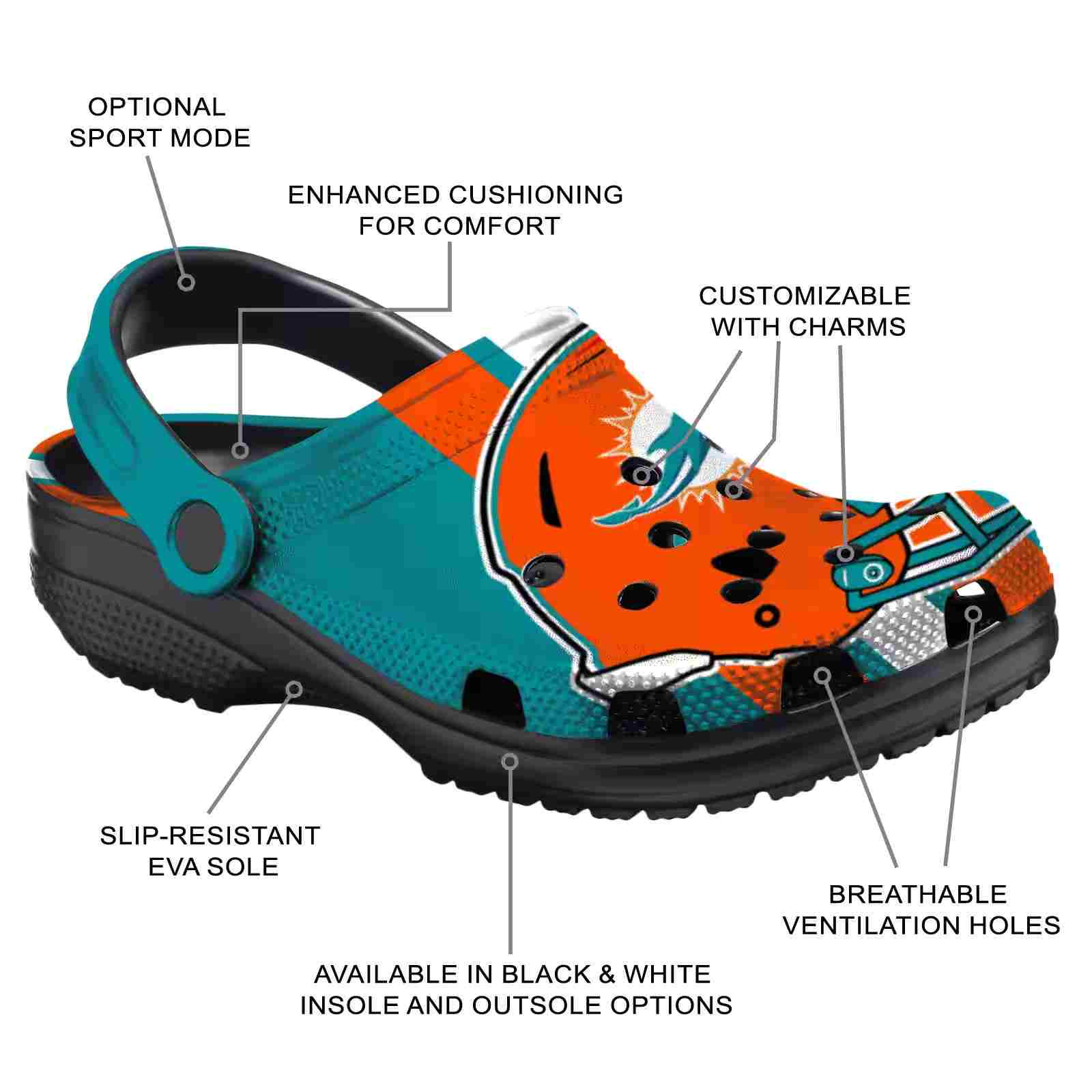 As part of our Miami Dolphins Crocs and NFL Crocs collections, these unique Clog are designed to let your love for your favorite shine bright.