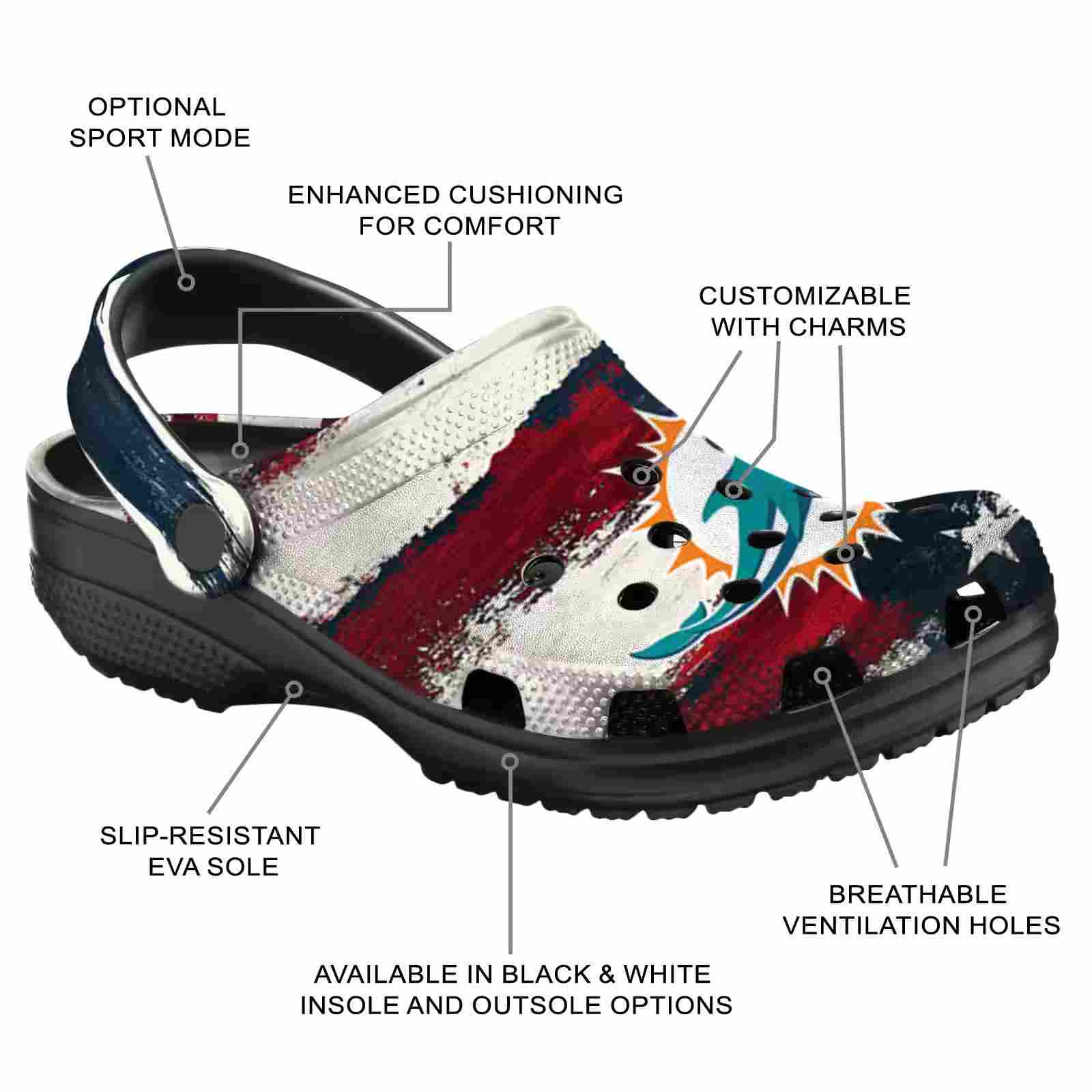 As part of our Miami Dolphins Crocs and NFL Crocs collections, these unique Clog are designed to let your love for your favorite shine bright.