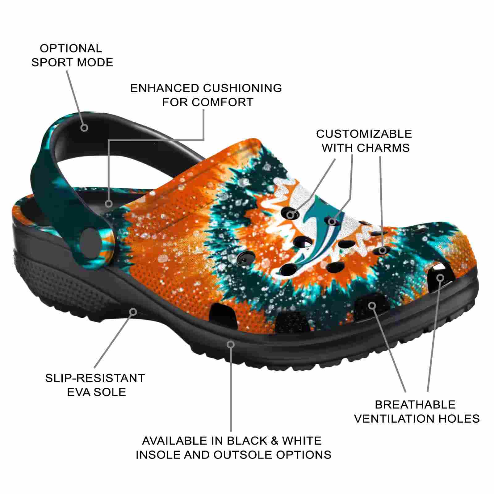 As part of our Miami Dolphins Crocs and NFL Crocs collections, these unique Clog are designed to let your love for your favorite shine bright.
