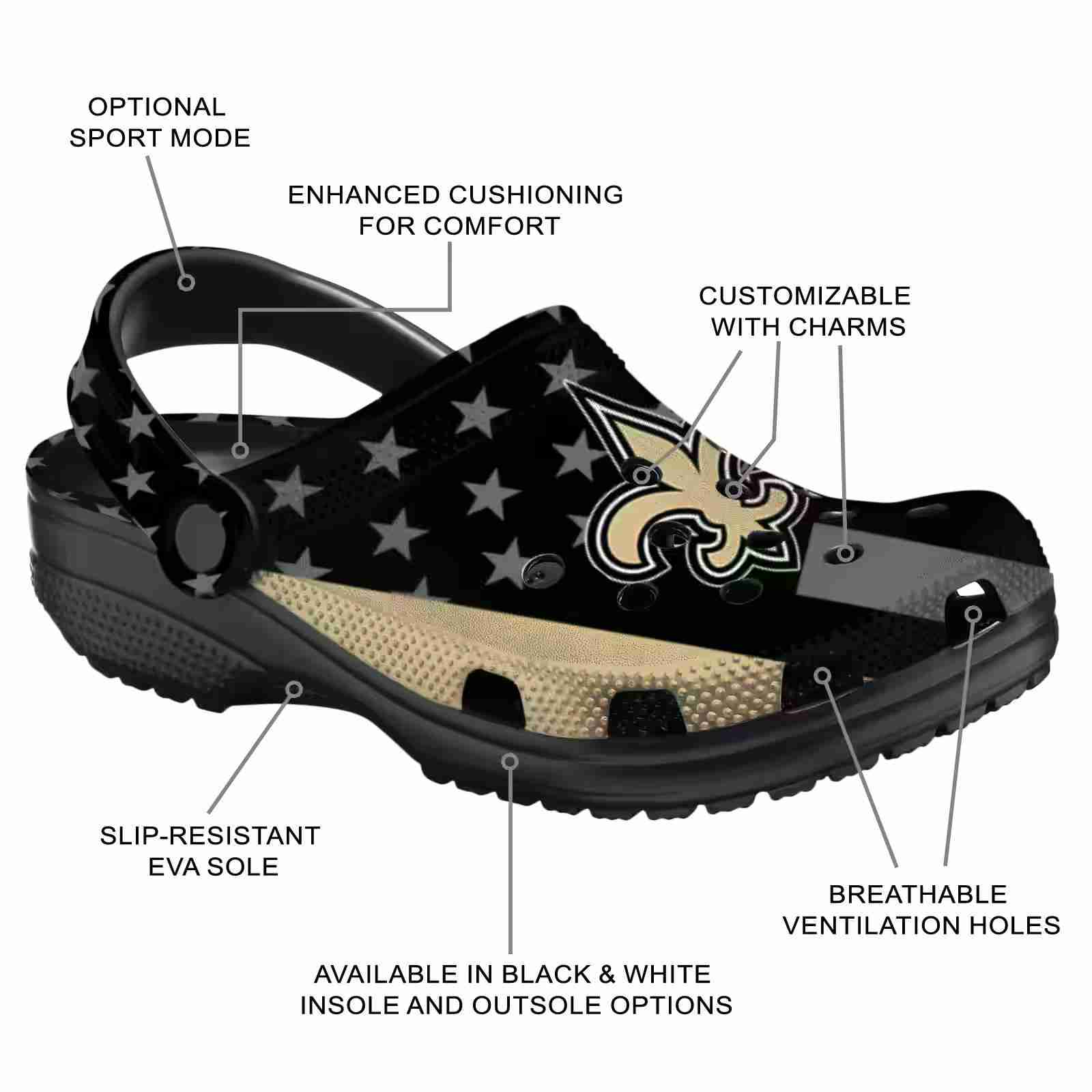 As part of our New Orleans Saints Crocs and NFL Crocs collections, these unique Clog are designed to let your love for your favorite shine bright.