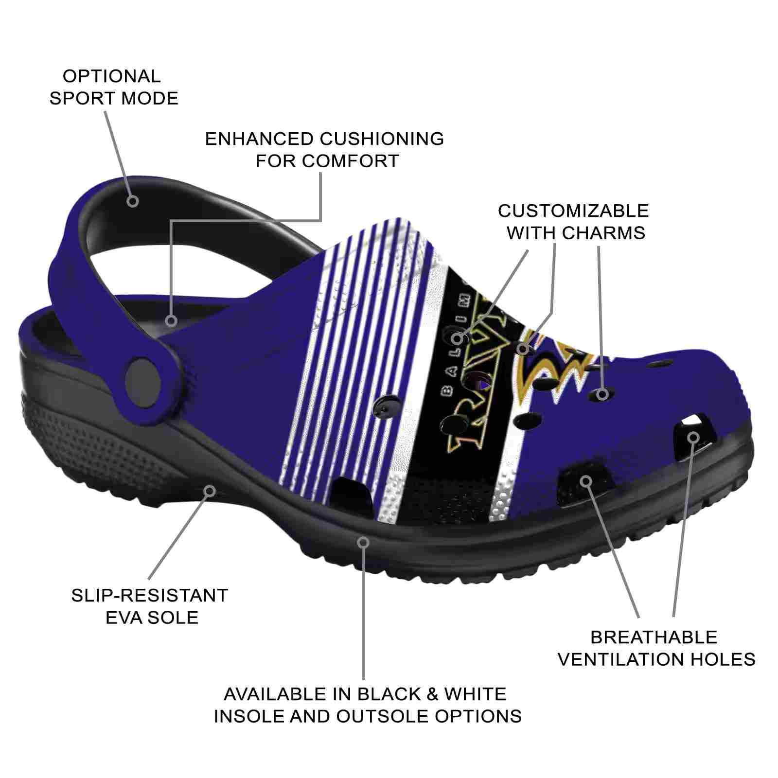 As part of our Baltimore Ravens Crocs and NFL Crocs collections, these unique Clog are designed to let your love for your favorite shine bright.