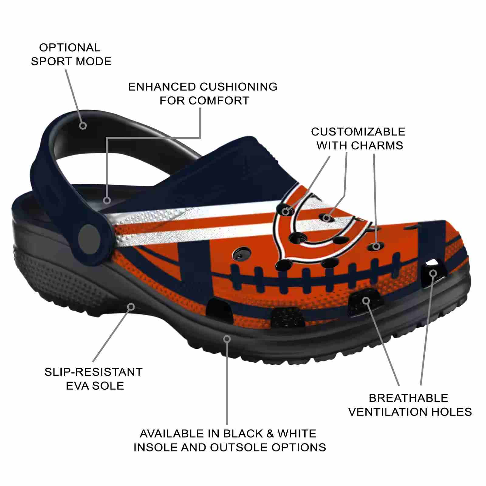 As part of our Chicago Bears Crocs and NFL Crocs collections, these unique Clog are designed to let your love for your favorite shine bright.