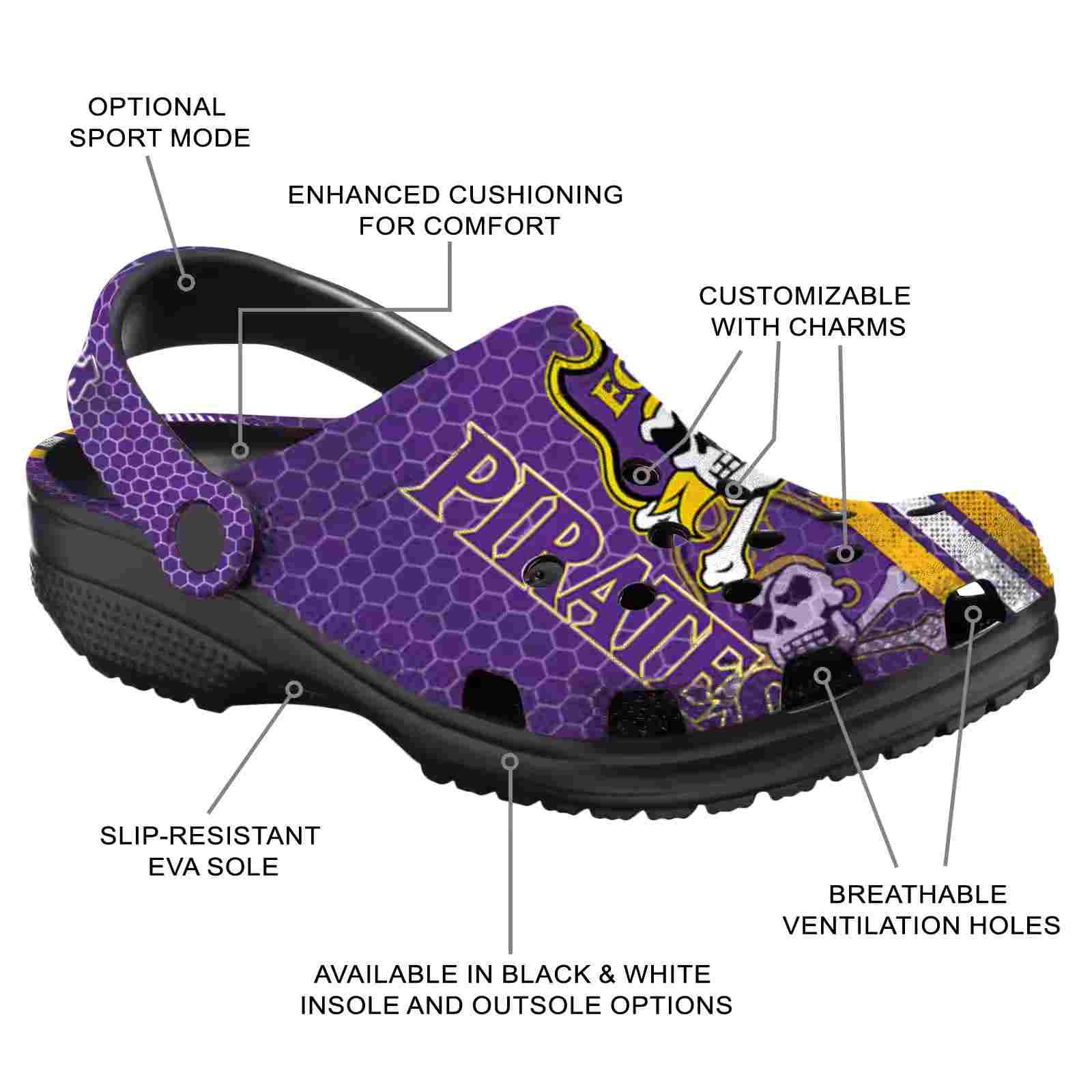 As part of our East Carolina Pirates Crocs and NCAA Crocs collections, these unique Clog are designed to let your love for your favorite shine bright.