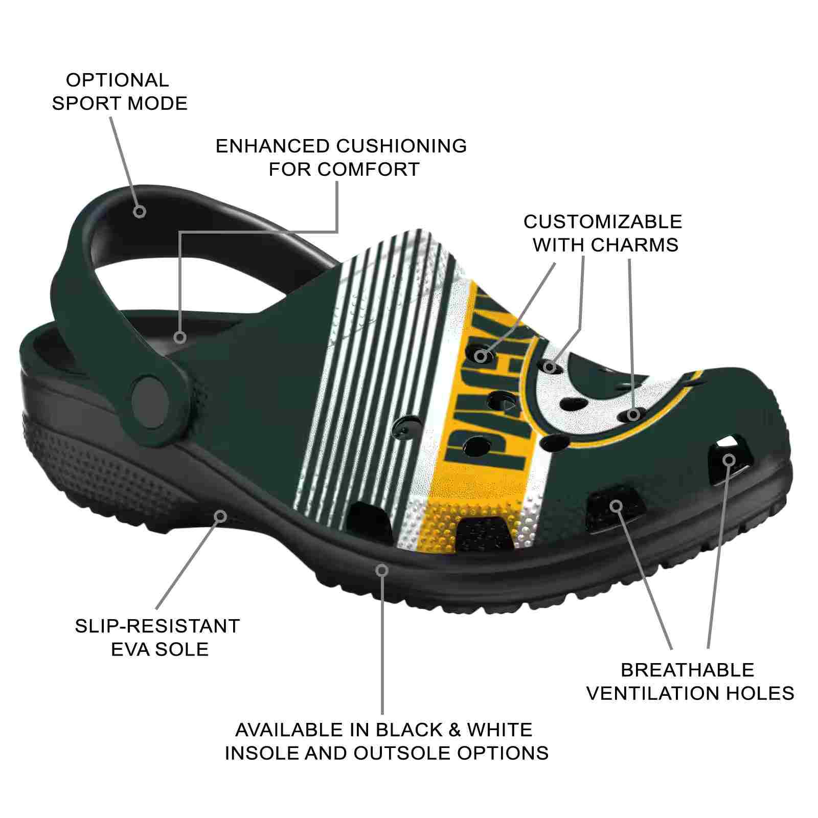 As part of our Green Bay Packers Crocs and NFL Crocs collections, these unique Clog are designed to let your love for your favorite shine bright.
