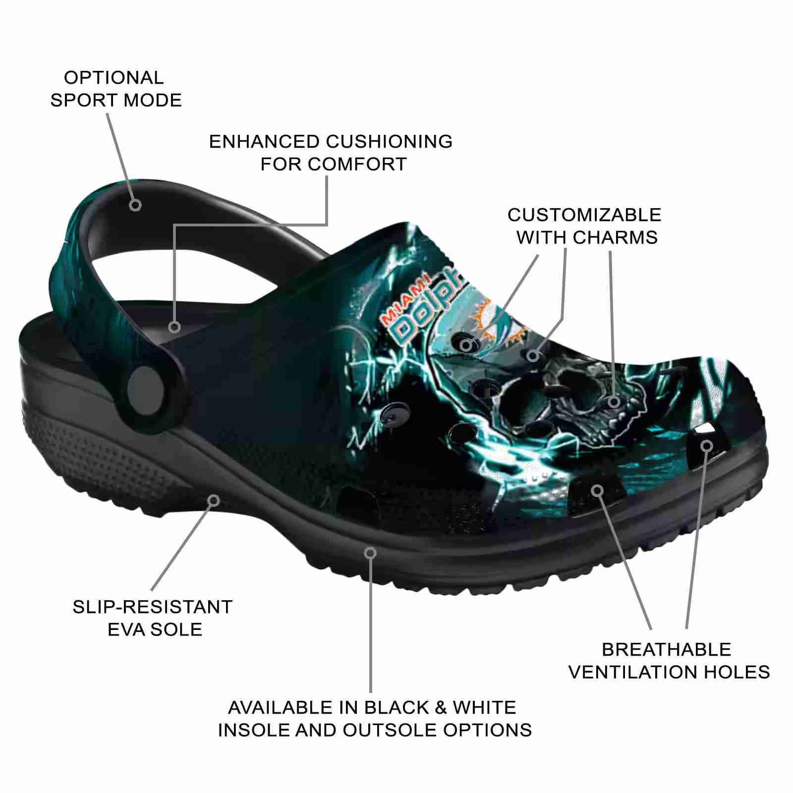 As part of our Miami Dolphins Crocs and NFL Crocs collections, these unique Clog are designed to let your love for your favorite shine bright.