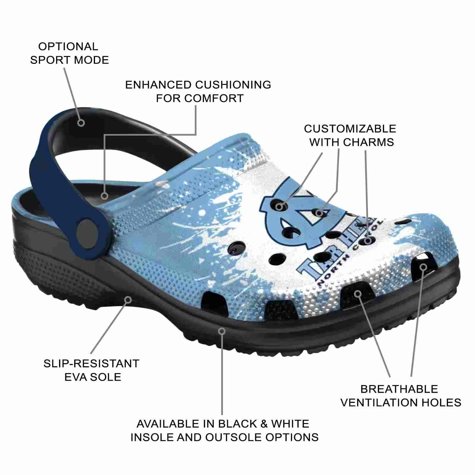 As part of our North Carolina Tar Heels Crocs and NCAA Crocs collections, these unique Clog are designed to let your love for your favorite shine bright.