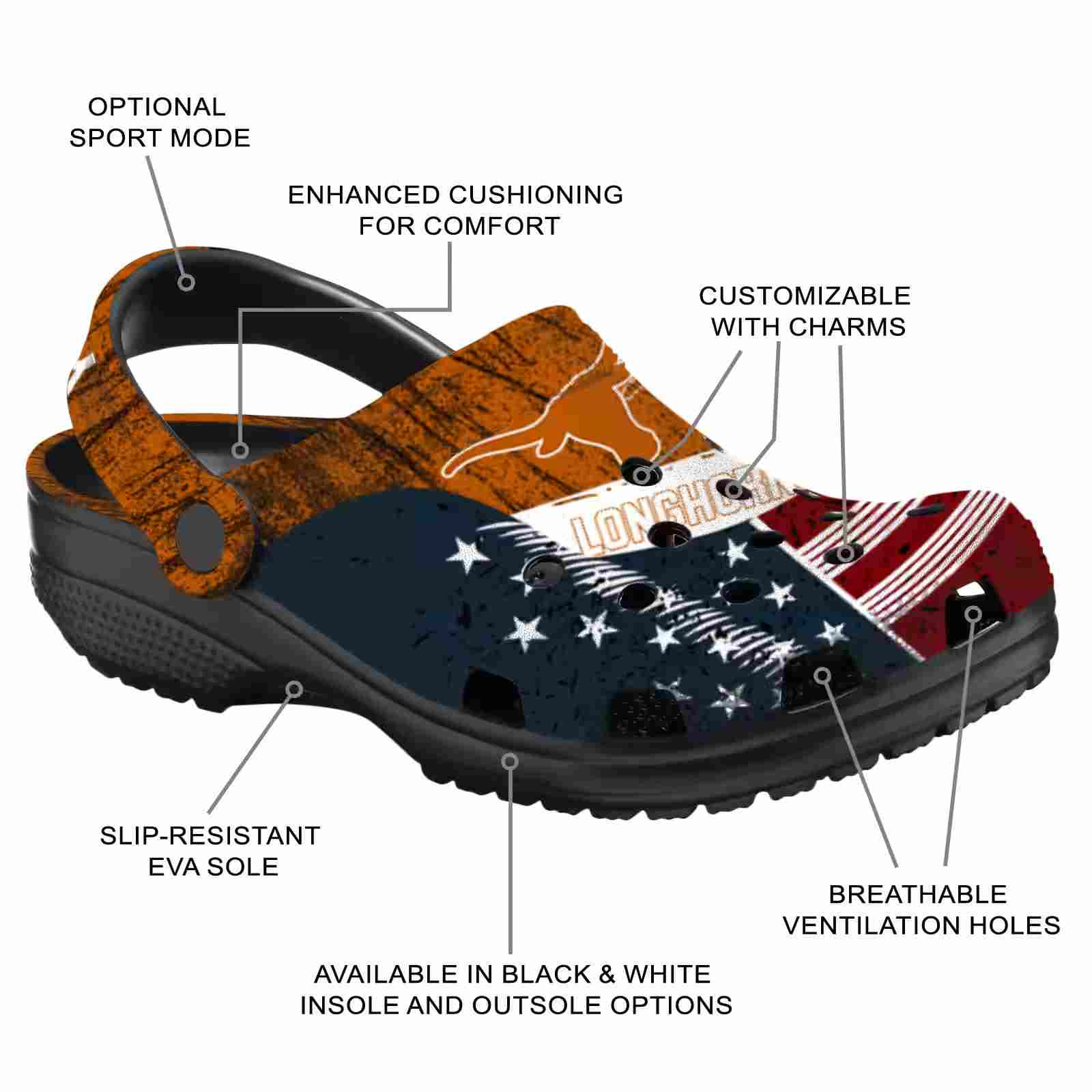 Personalized Texas Longhorns Star-Spangled Side Pattern ClogTVC180167